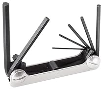 Klein 70582 Review: Klein 70582 3-5/8-Inch Folding Hex-Key Set with 7 Metric Sizes. This US-made key set is well made. The handle is nicely chromed, uniformly shiny across. The screws and nuts are black. The screws have round hex heads. The inside plate under the keys is tight and does not move. The set, as a whole, is very compact, almost exactly comparable to the standard Eklind 20912 Fold-Up Set #91S, 0.050-Inch to 3/16-Inch Hex Keys:Handle Length = 3" 5/8Handle Width = 11/16Handle Depth = 13/16The set is compact, although dense (134g), and is probably small enough to be taken biking in the ... Read more »